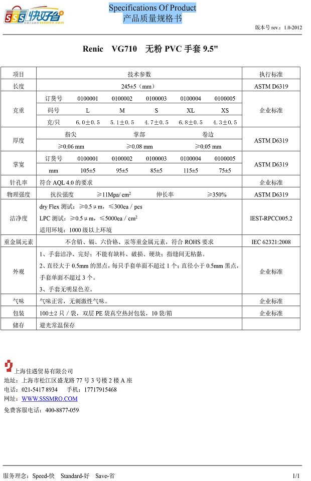商品名称:Renic 无粉PVC手套9.5" 透明