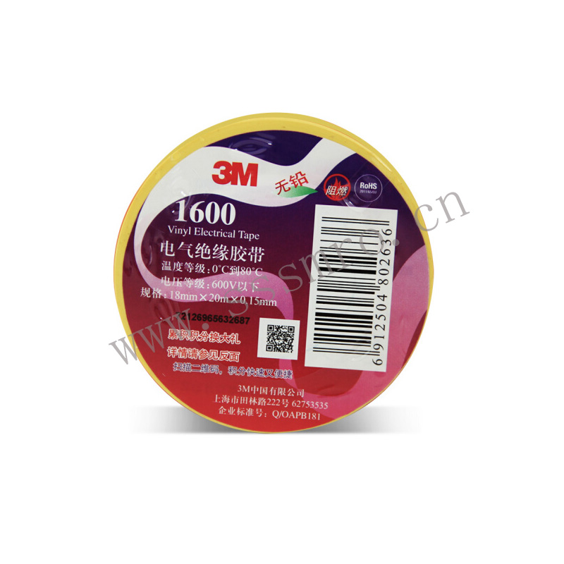 3M PVC电工绝缘胶带 黄色 1600# 20米 200卷/箱